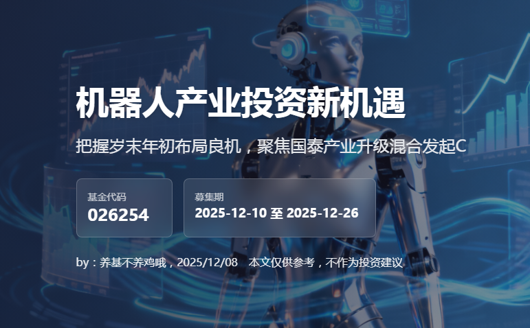 转眼2025年就剩最后半个多月了,往年这个时候,要么是盯着震荡的股市犯愁,要么是对着收益平平的固收产品叹气,总觉得想找个“踏实又有潜力”的投资方向比挤早高峰地铁还难。但今年不一样,以新质生产力为代表的科技领域,持续引领着当下A股的主风向,特别是机器人,在经历了前段时间的“低谷期”之后,似乎又有了一些起色。对此,我是不想错过机会的,近期也是打算利用国泰产业升级混合发起C(026254)这支新基金进行岁末年初的布局。(自选图在文末哦)