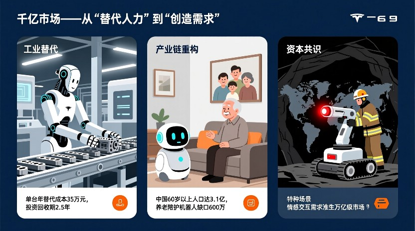 - 工业替代:特斯拉Optimus单台年替代成本35万元,投资回收期仅2.5年,预计2030年全球工业需求超百万台。