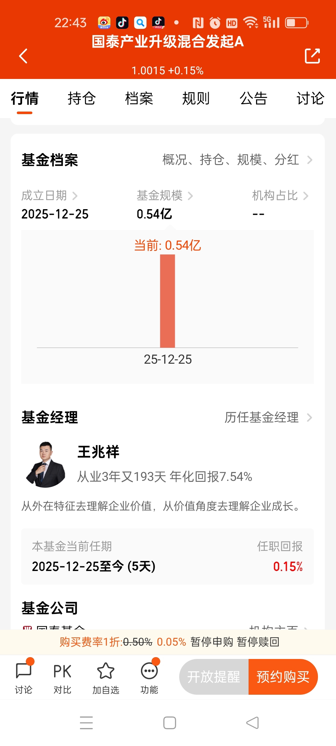 本基金因为是新基金,因为今年股市行情好,已经在12月25日提前募集结束了,然后要等到下次打开申购时,再去购买。本基金经理是王兆祥,从业3年又193天,年化回报7.54%,也是国泰基金旗下的投资能将之一。