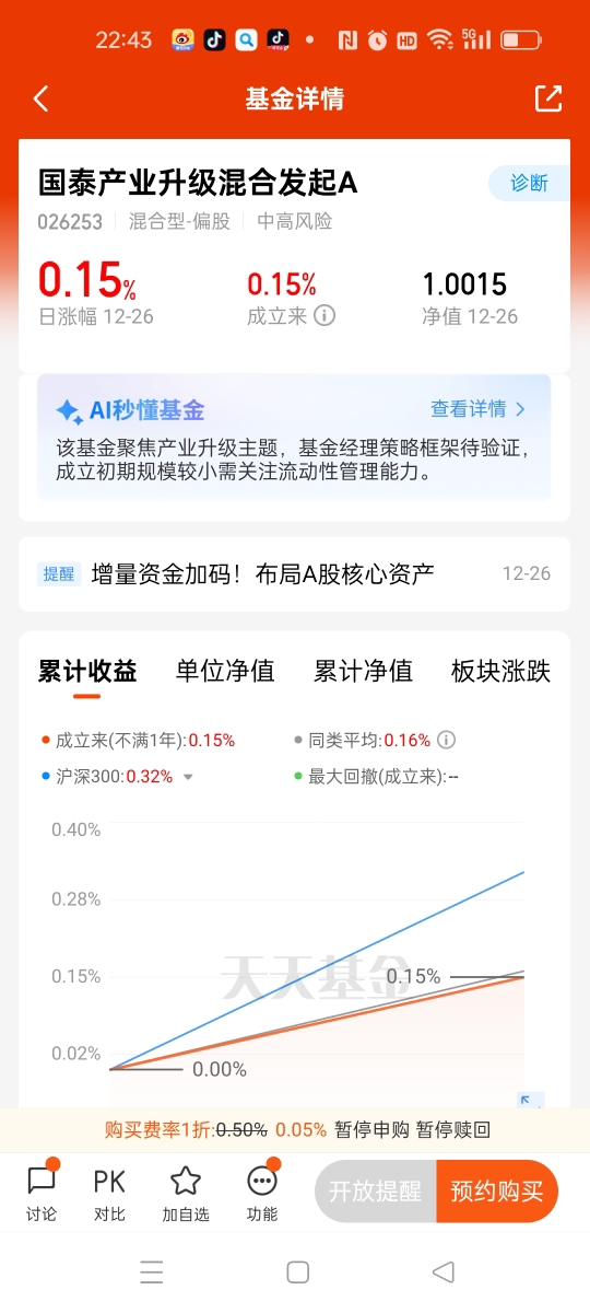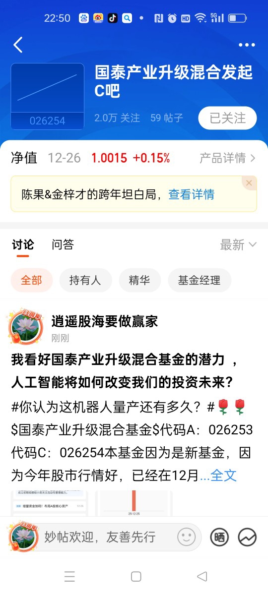 这个基金是国泰基金新年前发行的机器人赛道基金,$国泰产业升级混合发起A$,代码A:026253和代码C:026254,基金经理是王兆祥。基金经理在成立资金募集后,会对基金进行布局投资,买卖哪些股票都是需要来考验经理和他率领的团队的配合,也会定期公布净值。(本基金也是新一代浮动费率基金,管理费率与基金业绩直接挂钩,基金管理人与投资者利益深度绑定,以浮动管理费形式激励管理人争取更优的投资回报)