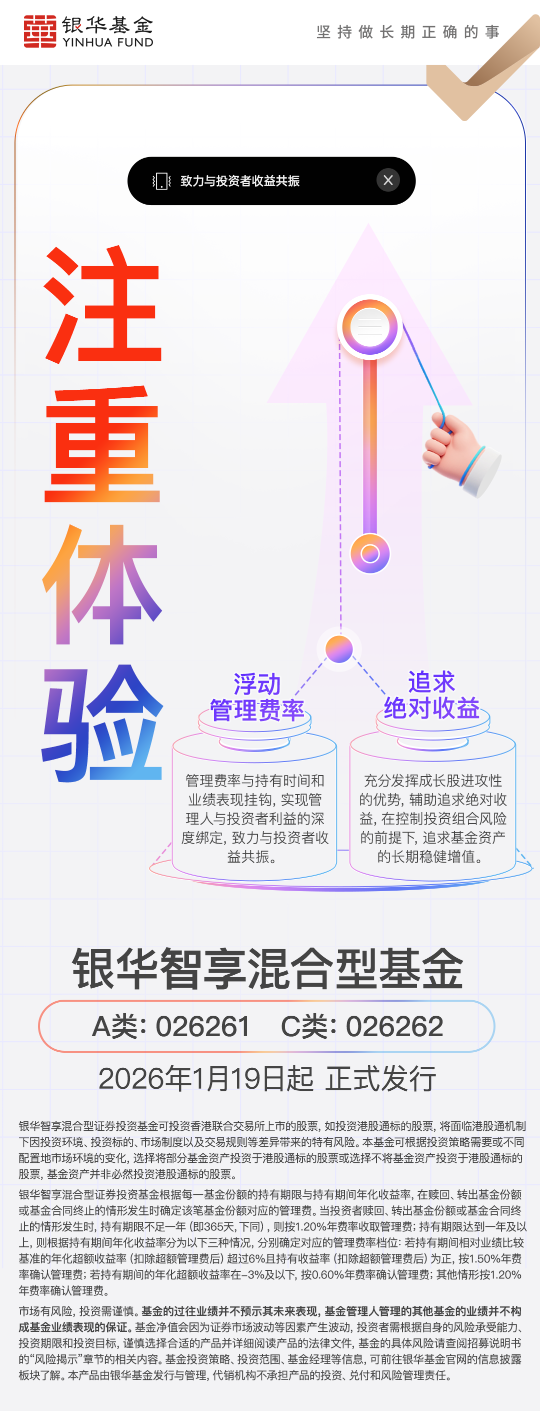 前瞻后市,机构普遍对2026年A股市场持乐观态度,认为结构性投资机会将持续涌现。看好后市的投资者,或可考虑选择机制透明、目标清晰、且与管理人利益高度一致的产品,比如正在发行中的银华智享混合(A类:026261,C类:026262),以借助专业之力挖掘长期价值。(资料参考:经济日报《基金市场科技赛道愈发清晰》,2026.1.30)