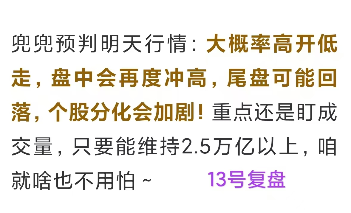 明天行情预判:早盘大概率低开反抽,红盘或接近翻红后再度回落!宝子们记住:早盘低开千万别慌着割肉,场内操作就低吸高抛,等反抽再择机应对!慢牛行情要抓对大方向,牛歇一歇才能走更远,夯实底部筹码,好日子才会长久,降温的意义是让行情更持久,绝不是行情结束!而且今天老权重的调整,只会让资金进一步向主线板块集中!