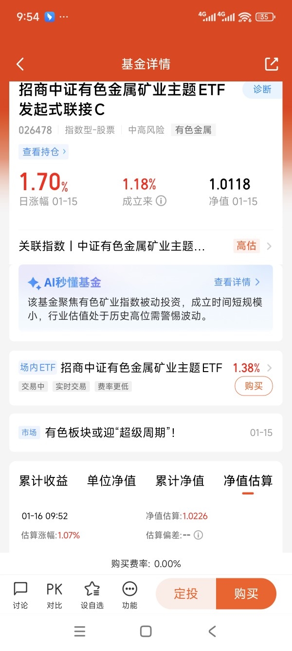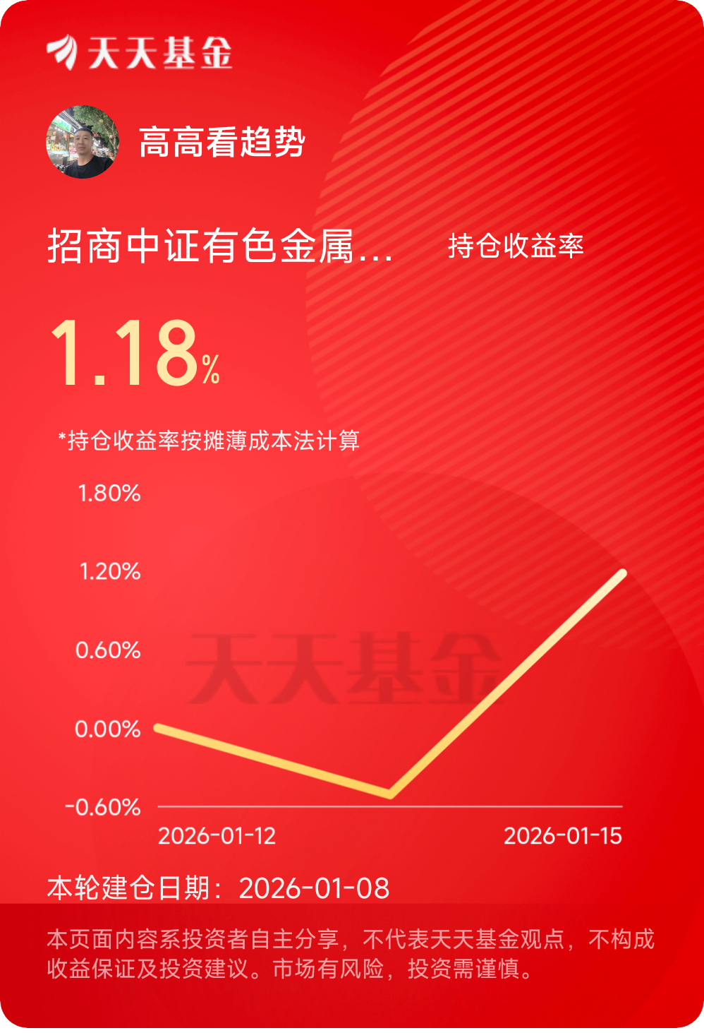 $招商中证有色金属矿业主题ETF发起式联接C$ 这只聚焦有色金属的指数基金。紧密跟踪中证有色金属矿业指数。全面覆盖了金 银 铜 铝,等多个金属行业,昨天上涨了1.7%。爆发力的表现好。今天的估值又超一个点!目前主力资金还在流入,有色金属目前估值正在被重构。我看好基金今年的稳定成长表现。