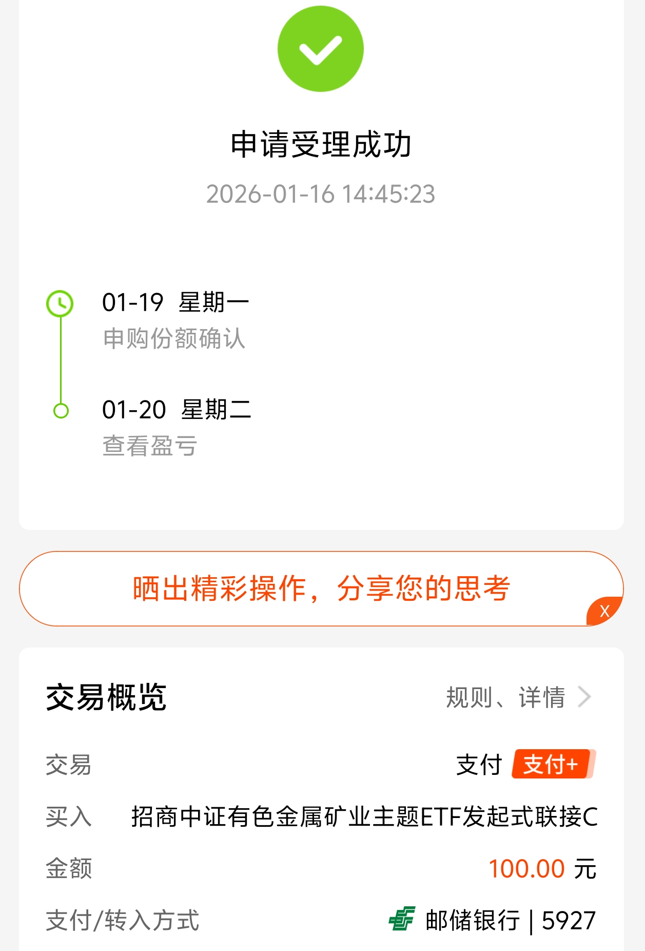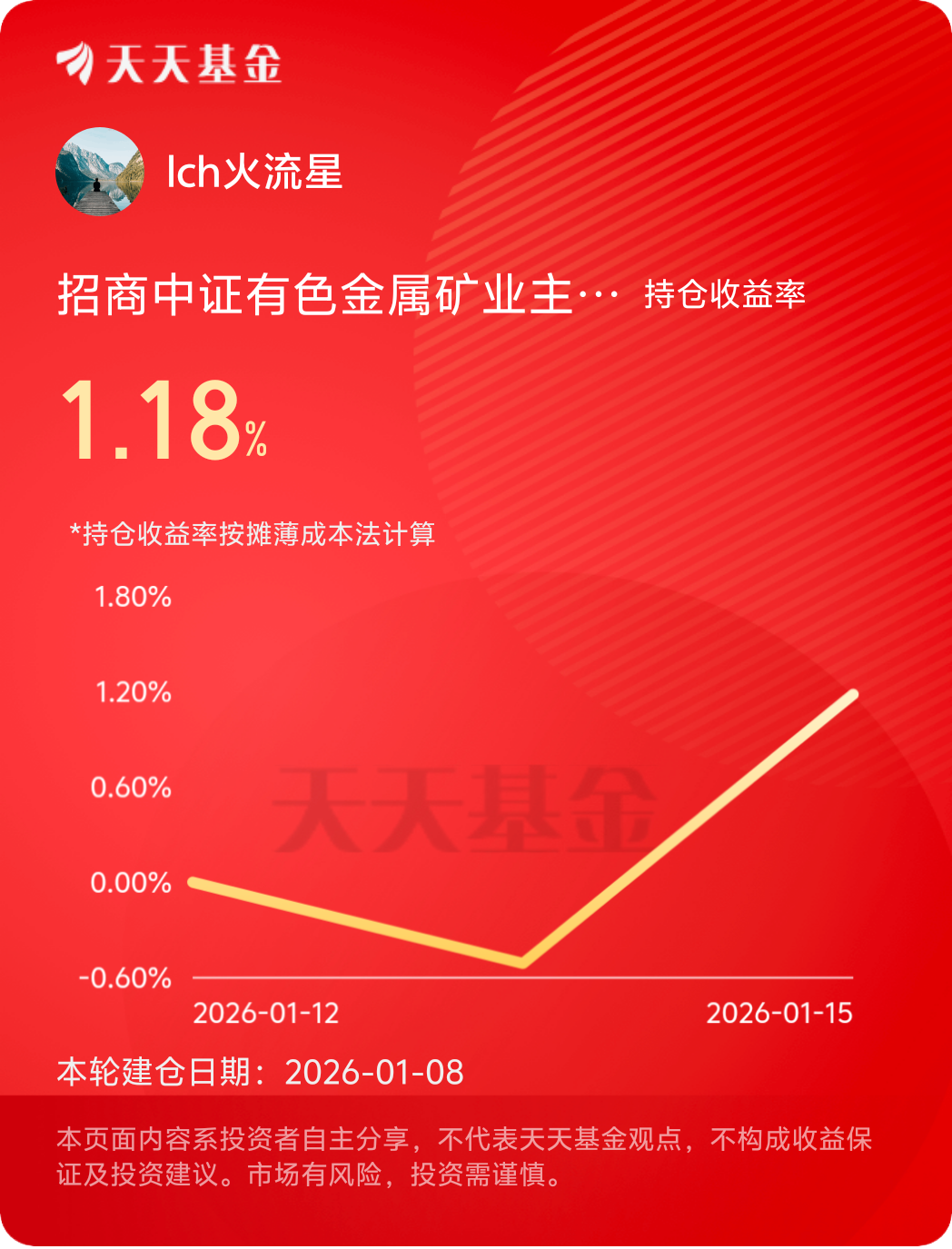 今天市场又是震荡行情,终止连阳后,板块轮动速度加快。值得注意的是,近阶段以来有色金属持续性还是不错的,小幅度持续上涨。开年来国际金价银价,大宗商品,不断创新高。受此影响,流星相信有色金属后市可期。$招商中证有色金属矿业主题ETF发起式联接C$ 招商中证有色金属矿业主题指数C,主要跟踪有色金属指数,受供给刚性和新能源需求利好驱动,有望享受板块上行红利,其经理风控稳健,择时建仓布局。跟上经理优秀步伐,会有意想不到的惊喜。现国际局势不稳,加之美联储降息预期升温,流星相信,有色金属后市还会有上升空间,今天继续定投100元。拿好筹码,干就完了