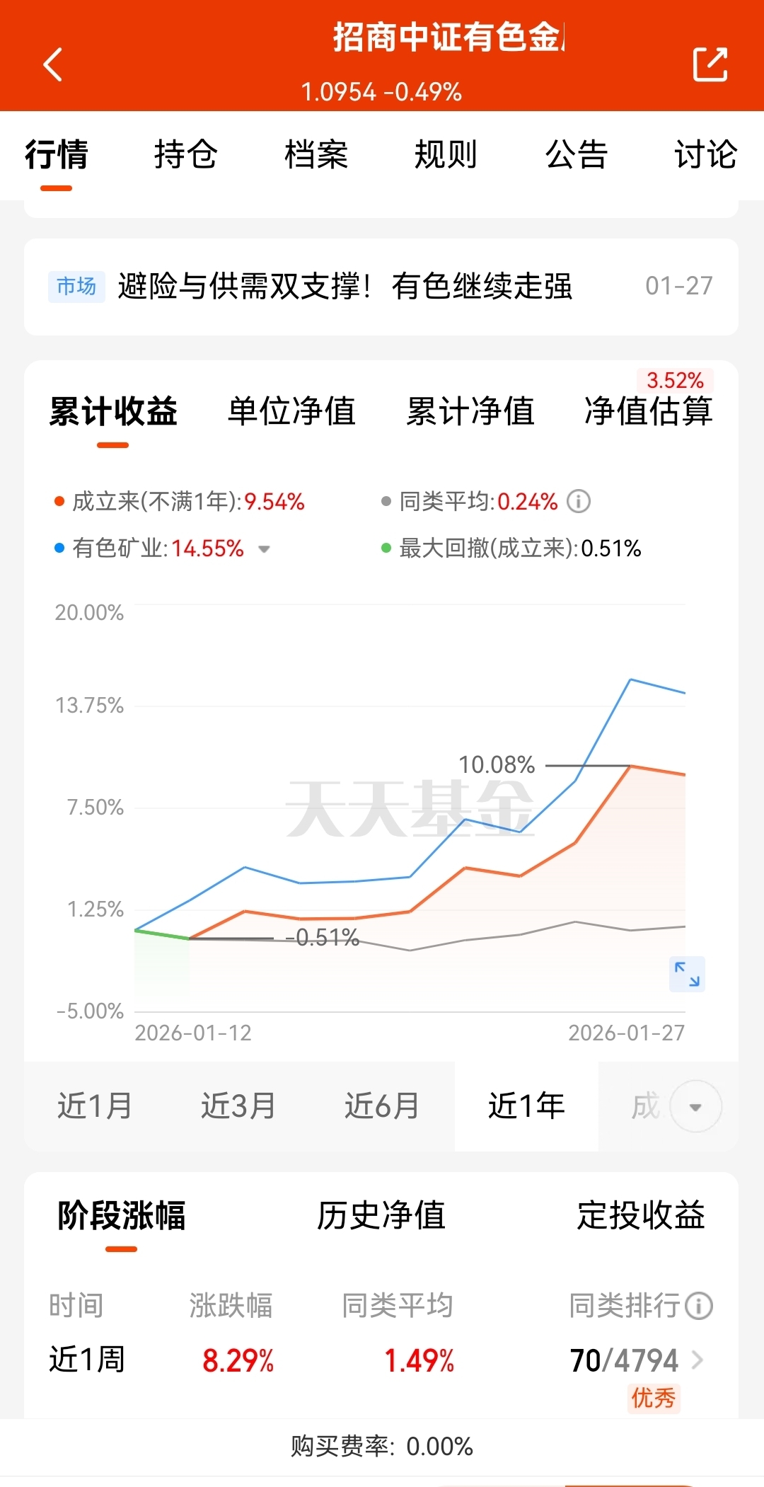 $招商中证有色金属矿业主题ETF发起式联接C$ 实时涨幅3.52%,近1周涨幅8.29%,有色金属的确定性行情太强了,这只铜含量高,涨幅更给力!