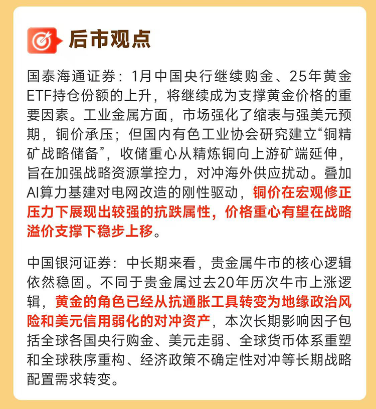 中国银河证券:中长期来看,贵金属牛市的核心逻辑依然稳固。不同于贵金属过去20年历次牛市上涨逻辑,黄金的角色已经从抗通胀工具转变为地缘政治风险和美元信用弱化的对冲资产,本次长期影响因子包括全球各国央行购金、美元走弱、全球货币体系重塑和全球秩序重构、经济政策不确定性对冲等长期战略配置需求转变。