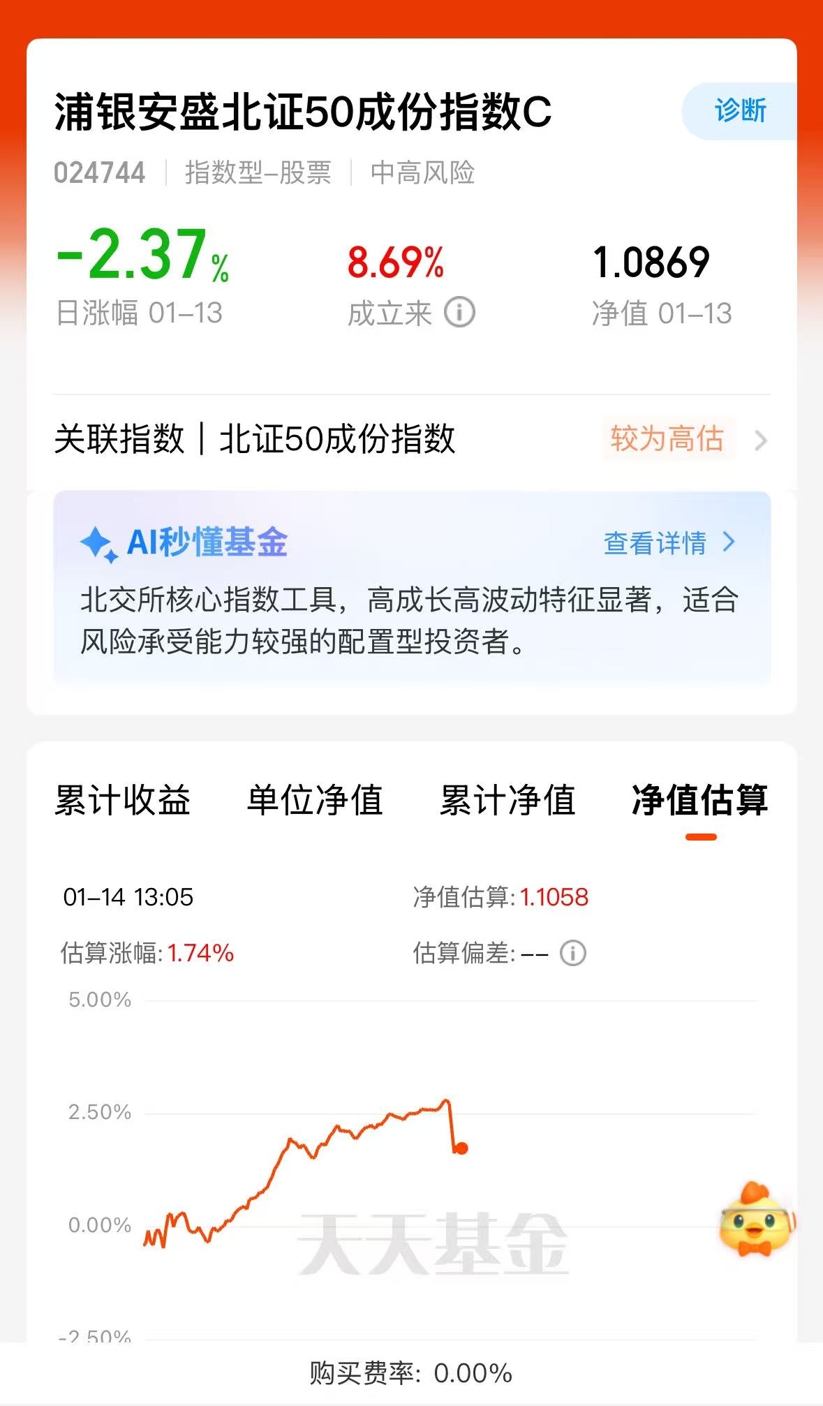 大部分北证50基金都限购,浦银安盛这只额度管够,跟踪紧密今日超额,费率低还方便补