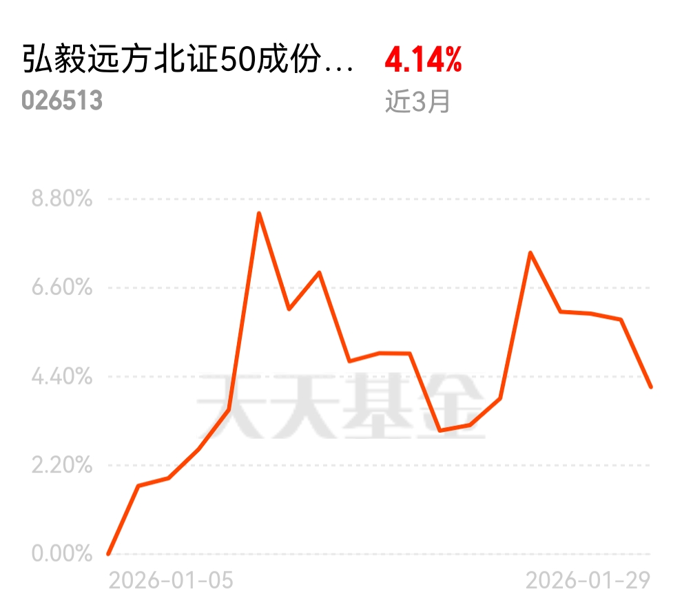 北交所合格投资者总数近950万户,资金进场的基础越来越扎实,北证50今日的回调果断布局一波。弘毅远方北证50成份指数I份额不仅短期涨幅可观,0.1%的服务费更是降低了参与门槛,小散也能轻松分享北证50的成长红利,920号段交易也很便捷。现在做市商扩容提升了流动性,Q1ETF已列入证监会宽基ETF优先标的,获批在即,打新冻资破1.06万亿,电子、计算机等细分板块估值优势明显,北证50的布局价值越来越高。