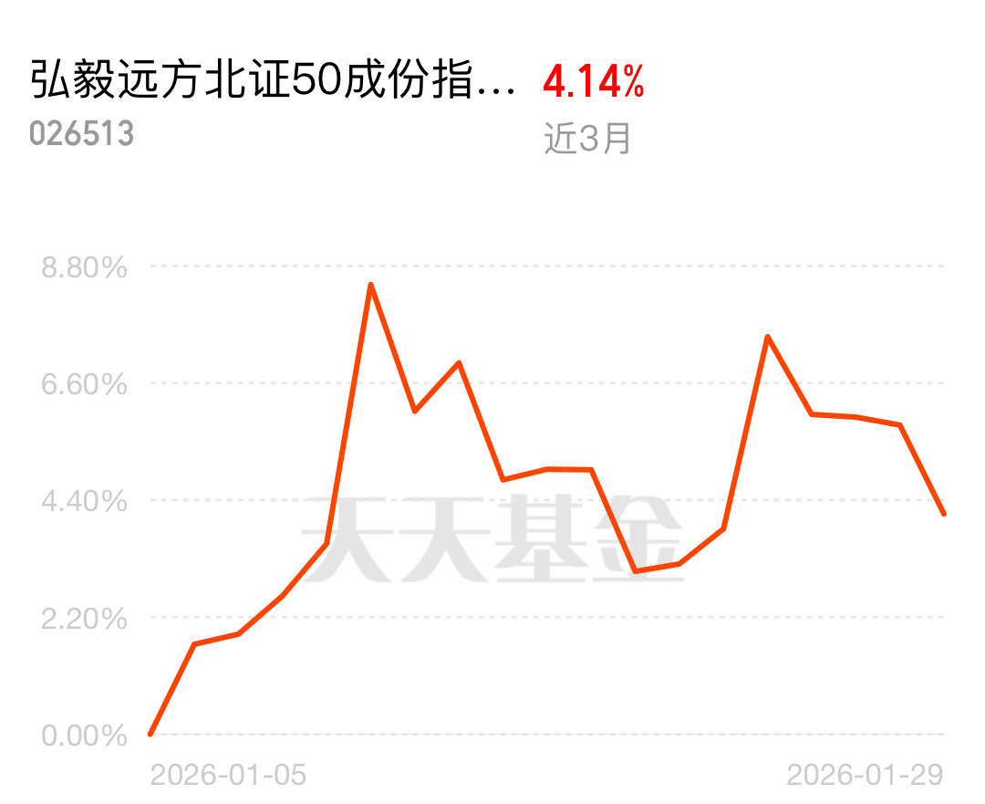 看到三部门将个人消费贷款财政贴息政策延至2026年底,市场流动性预期更友好,北证50今日的回调就是布局窗口,直接动手了。弘毅远方北证50成份指数I份额近阶段表现很稳,在震荡市中走出了不错的涨幅,服务费0.1%大大降低了长期持有的成本损耗,适合普通投资者跟上赛道节奏。现在做市商队伍不断扩大,920专属代码加持交易,Q1ETF获批发行在即,千亿增量资金待入场,医药并购和硬科技赛道利好不断,北证50估值洼地属性突出。#多重利好引爆白酒股!行情能否持续?# #AI助手Clawdbot爆火!AI应用迎布局机会?#