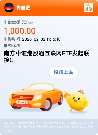 #晒操作#今日上车$南方中证港股通互联网ETF发起联接C(OTCFUND|026555)$,这只新发基金明天下午发行就截止,春节快到了,搞点年货(就要新基),心里踏实。