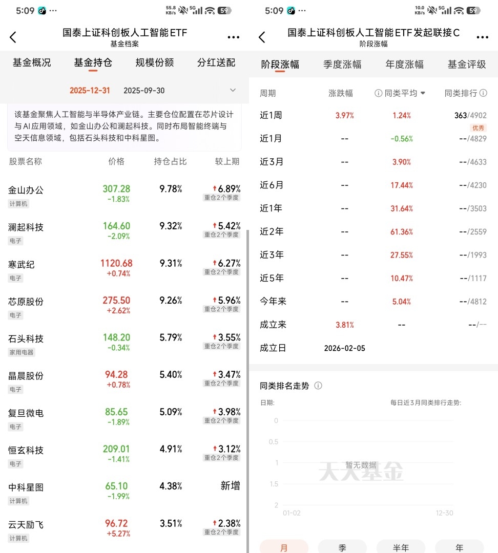 而国泰上证科创板人工智能ETF联接C,踩的是科创板AI的赛道,主打芯片、算力硬件这些硬核科技,国产替代属性更强,受外围干扰小,政策加持更直接,走势更稳,适合长期拿着。这俩一个攻一个守,刚好互补,不用二选一。
