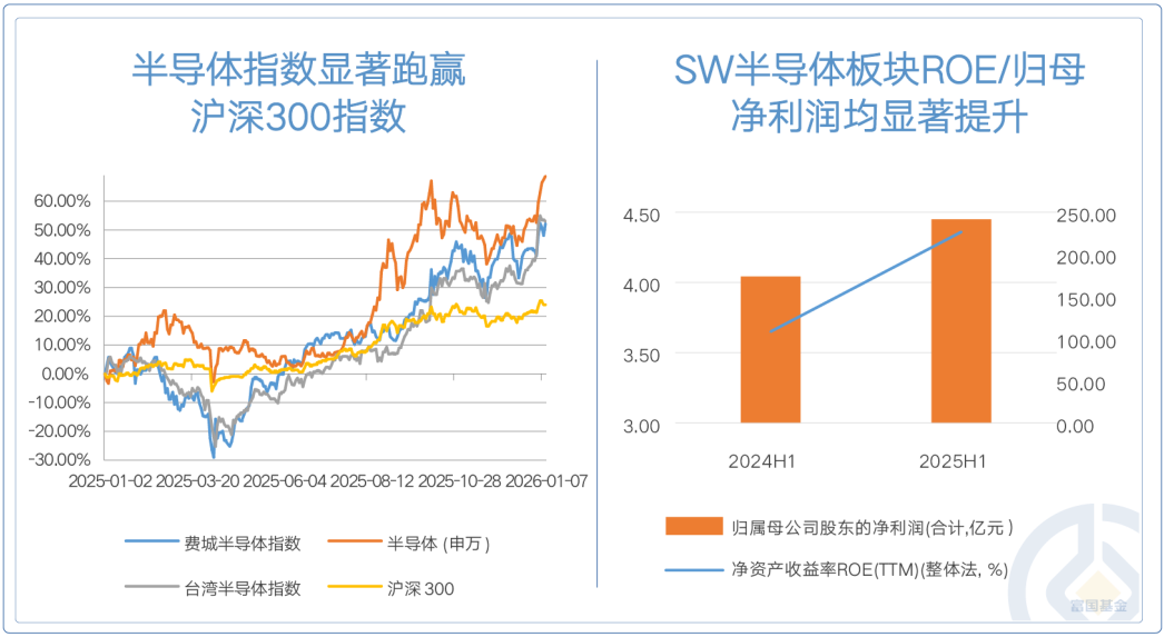 数据来源:Wind,截至2026年1月10日。图二行业分类为申银万国行业类(2021)-SW半导体板块。指数历史情况不预示其未来收益,也不构成对本基金业绩表现的保证。半导体(申万)指数(801081.SI)以1999年12月30日为基日,自2021年至2025年近5个完整会计年度的收益率分别为33.32%、-37.11%、-5.60%、24.48%、45.99%。市场有风险,投资须谨慎。指数历史情况不预示其未来收益,也不构成对本基金业绩表现的保证。本基金为主动管理型基金,具体投资范围及标的由基金经理根据法律文件及市场情况确定,不必然投资于本文用作举例的方向/板块/行业
