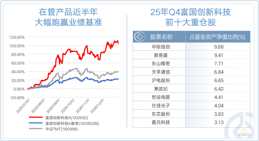 注:富国创新科技混合A近六个月净值增长率及同期业绩比较基准收益率数据来源于富国基金,截至2025年12月31日,基金净值增长率和业绩比较基准收益率已经经托管人复核,基金收益率不代表投资者实际收益率,基金份额净值仅为每份额基金产品的净资产。同类排名数据来源于Morningstar晨星,截至2025/12/31,同类排名为3/314,同类产品为中国 开放式基金-行业混合-科技、传媒及通讯:同类排名数据由MORNINGSTAR版权所有。晨星及其内容供应商对于您使用任何相关资料而作出的任何有关交易,投资决定均不承担任何责任。过往业绩不代表将来表现。同类排名结果系评价机构基于基金过往表现综合判定,并不构成对基金管理人或单只产品的未来投资建议。基金有风险,投资需谨慎。富国创新科技混合前十大重仓股来源于基金定期报告,截至2025年12月31日,仅为特定时点情况,不代表或预示当前及未来配置情况。富国创新科技混合A成立于2016/06/16,业绩比较基准为中证TMT产业主题指数*60%+中证全债指数收益率*40%。近5个完整年度(2021-2025)的基金份额净值增长率(及同期业绩比较基准收益率)为-7.27%(4.96%),-44.5%(-18.1%),-5.33%(4.96%),-4.61%(16.5%),133.99%(26.37%),数据来自基金定期报告,截至2025/12/31。期间基金经理变动情况:李元博(2016/06/16-2025/07/15)、罗擎(2025/07/15至今)。基金收益率不代表投资者实际收益率,基金份额净值仅为每份额基金产品的净资产。基金历史业绩不构成对未来业绩的保证。