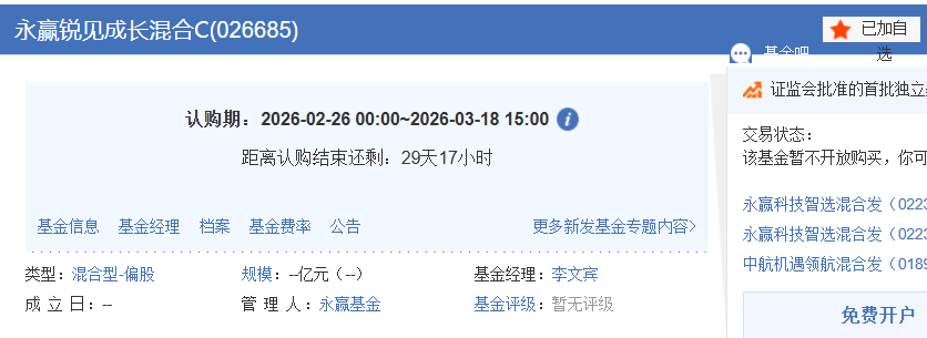 新发基金的期待:永赢锐见成长将于2月26日-3月18日募集,这只产品由投资名将李文宾亲自挂帅,他也是永赢基金权益投资联席总经理,会在全市场挖掘高质量的成长企业。