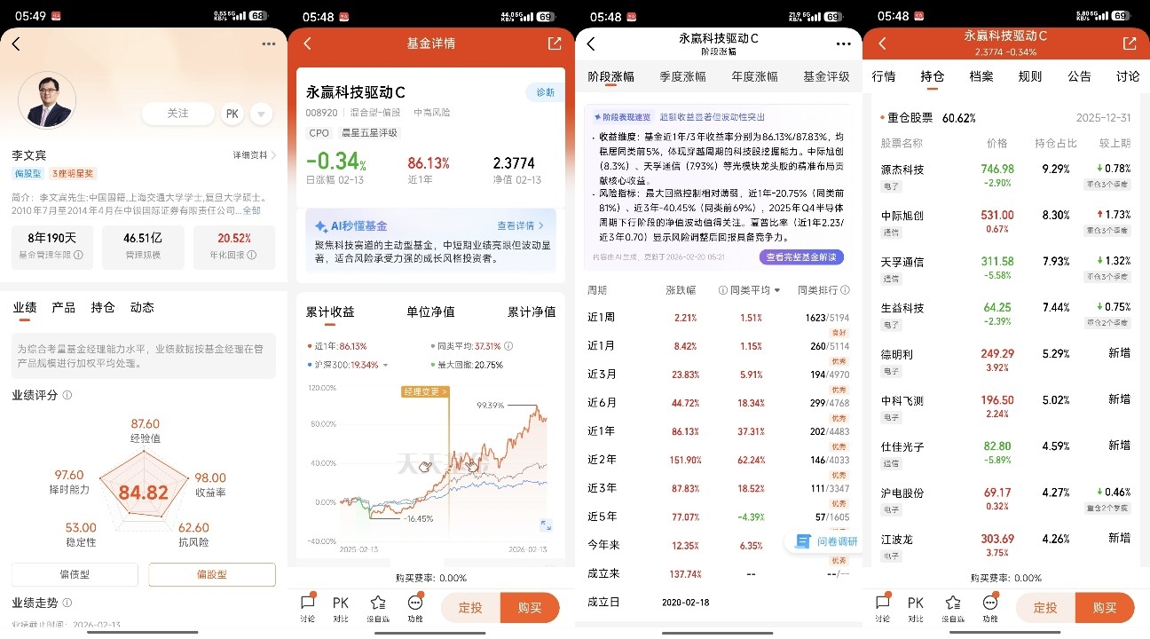 第一,业绩硬得惊人。 他管理的永赢科技驱动A,自2024年9月9日上任至2026年1月25日,任职回报达161.36%,远超同期基准71.44%。永赢锐见进取A自2025年1月23日成立至2026年2月15日,任期回报121.22%,同类排名59/8194。这不仅是数字,更是其“高质量成长”方法论的有效印证。