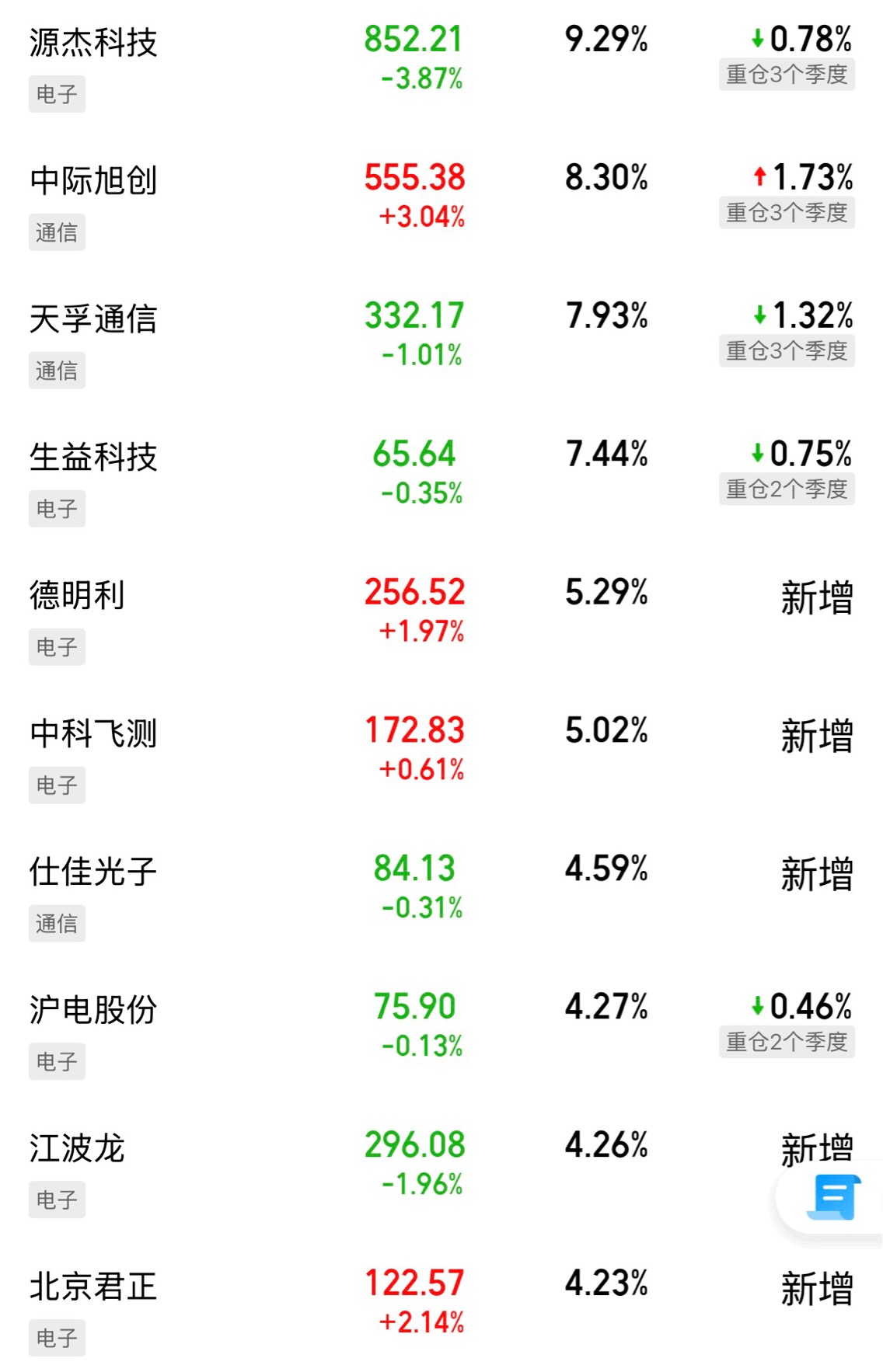 他的操作秘诀是“右侧的左侧”。听起来有点绕,其实就是:不是盲目逆向抄底,而是在行业出现积极变化、但市场还没完全反应过来的时候先进场一部分仓位,随着基本面得到验证再逐步加仓,捕捉行情主升浪。同时,他有严格的止盈纪律,也不回避“卖错后买回”的灵活操作。这种打法,说白了就是既要进攻,又要防守;既要锐度,又要稳健。看永赢科技驱动混合基金最新的持仓,既有源杰科技、中际旭创、天孚通信这样的光模块龙头,也有中科飞测、德明利、江波龙这样的半导体标的,还有生益科技、沪电股份这类电子元器件公司。科技成长的高弹性和稳健经营的压舱石,搭配得相当均衡。