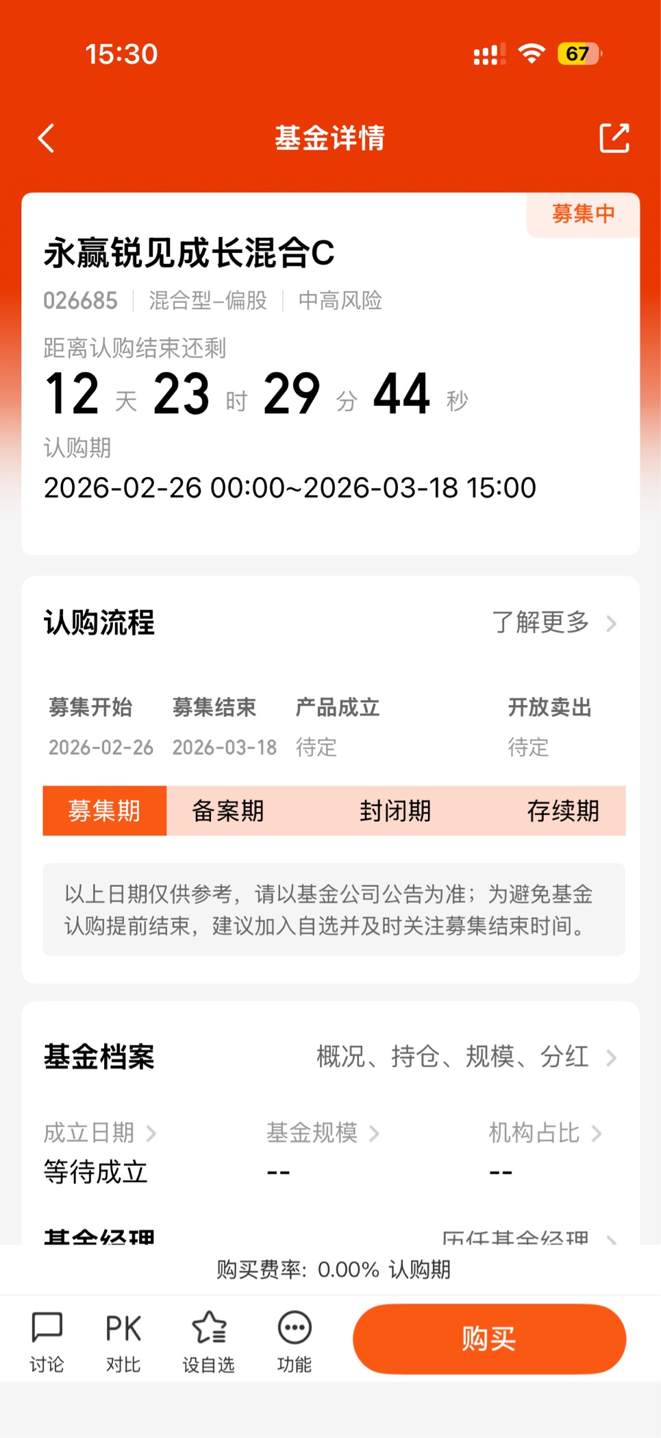 回到这只新基金本身。永赢锐见成长混合(A类026684,C类026685),募集期是2026年2月26日到3月18日,募集规模上限60亿。管理费由固定管理费、或有管理费和超额管理费组成,具体收多少取决于每笔基金份额的持有时长和持有期间年化收益率水平。简单来说,就是业绩好、持有时间长,管理费可能更高;业绩一般、持有时间短,管理费会更低。这种设计把基金经理和投资者的利益绑得更紧,不是那种不管赚不赚钱都收固定管理费的“躺平”模式。股票仓位60%-95%,可投港股通标的,投资范围比较灵活。C类份额没有认购费,持有超过30天赎回费0.5%,超过180天免赎回费,对长期持有的朋友比较友好。