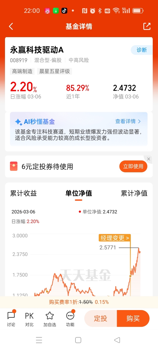 李文宾经理还有个代表作,就是$永赢科技驱动A$,代码:008919,是混合型偏股基金,中高风险、晨星五星评级,主投科技类的赛道,他任何1年又179天,任职回报164.23%,业绩很棒。