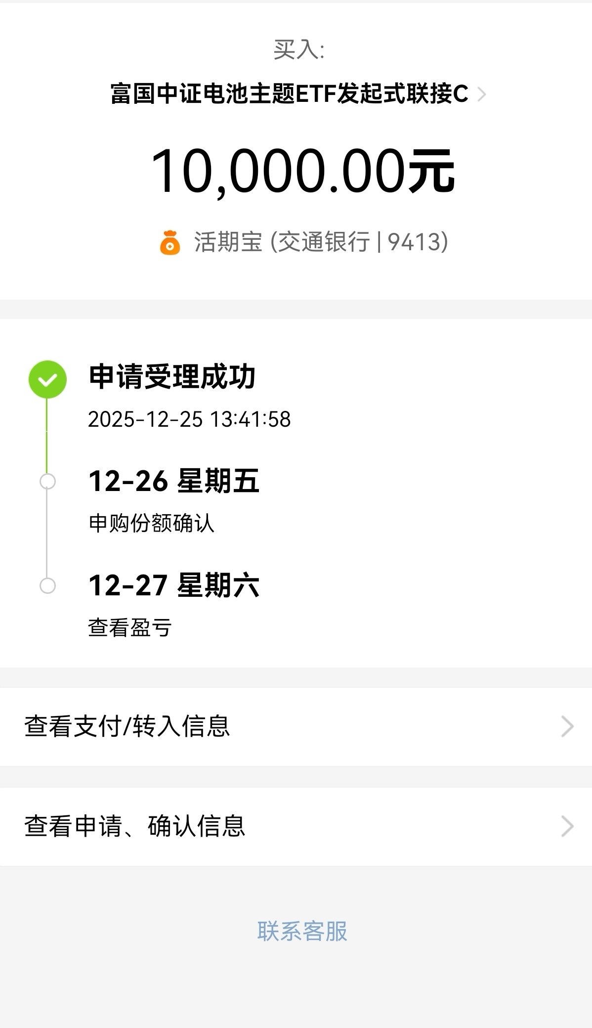 今天A股三大指数开盘涨跌不一、港股三大指数休市,盘中冲了一波后有所回落,大盘6连阳后回调点也正常,继续逢跌加仓就是,今日加1W富国电池$富国中证电池主题ETF发起式联接C$ 这只基金连涨了4天,今天回落不慌,说不定是倒车接人呢,业绩确实挺好的,近一年反弹超51.66%,同类平均才涨25.15%,足足翻倍了,真的很优秀啊。