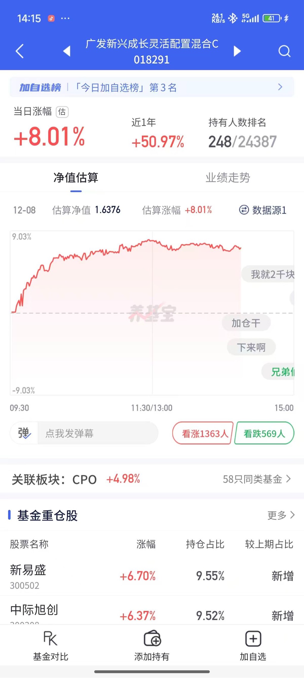 果然,CPO行情一来,广发新兴成长混合C又是大幅领涨8个点。我之前就注意到,它每次都能敏锐地跟上板块爆发,涨幅稳居市场前排。今天这个强度,直接加仓干$广发新兴成长混合C$