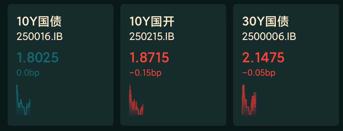 十年期国债收益率:1.8025%,+0BP(国债收益率越跌,债市越涨)