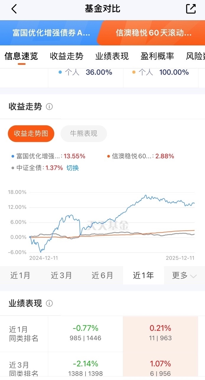 耐心持有真的有回报$信澳稳悦60天滚动持有债券C$ 三个月收了107个蛋,债市行情稳定向上,每天都有小收益进账年化预期快288了,值得长期相伴$富国优化增强债券A/B$