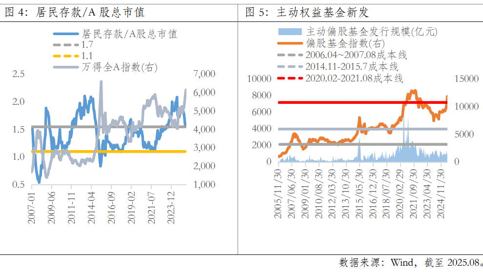 另一方面,从“居民存款/A股总市值”看,目前这一比值仍在1.7的历史高位,距离1.1左右的历史低位,仍有较大空间,这也就意味着“存款搬家入市”远未结束。而且值得注意的,居民资金偏“右侧”,所以“跑步入场”往往需要等基金整体净值突破上一轮密集发行区间的“成本线”,叠加赚钱效应的进一步积聚,才会吸引更多资金借基入市。对于本轮而言,上一轮主动权益基金的密集发行期是2020年2月到2021年8月,累计发行近2.6万亿元,成本线若是以万得偏股混合型基金指数衡量,则是在10747点。截至2025年9月17日,万得偏股混合型基金指数已涨至11873点,有效站上了扭亏阻力位,居民“借基入市”的步伐有望提速。