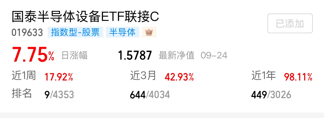 $国泰半导体设备ETF联接C$ 昨天大爆发,晚上净值暴涨+7.75%,真让人羡慕坏了呀,业绩领涨不少板块,表现可以说绝绝子! #上证指数#