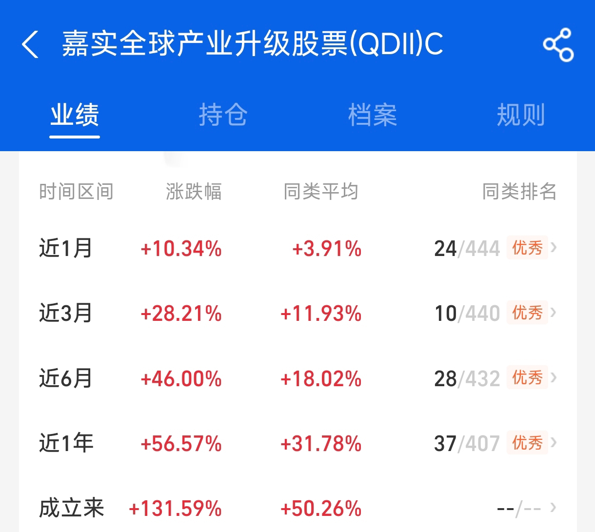 $嘉实全球产业升级股票发起式(QDII)C$ 这只宝藏基就很不错,布局全球市场,主打美股和港股,重点持仓科技前沿方向,重点持有英伟达、新思科技、中芯国际等优秀行业龙头,收益更是亮眼,近一个月上涨10.34%,3个月上涨28.21%,一年大涨56.57%,在同类中很优秀,布局科技,潜力大,爆发力强!我是长期看好的,目前正在持续定投中!希望给我好收益哈!