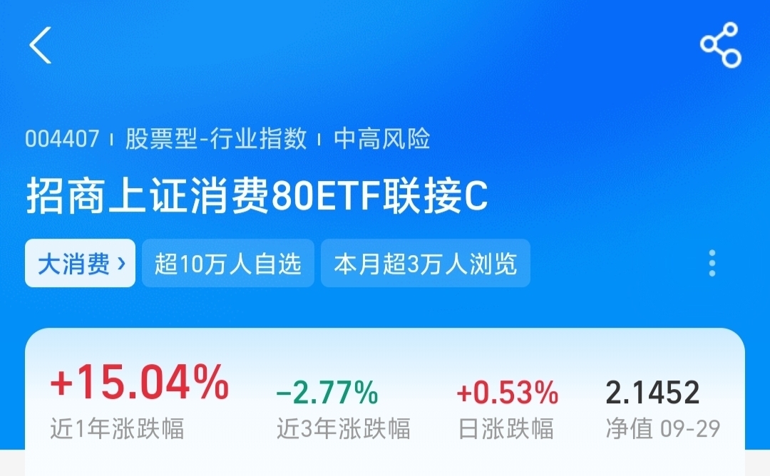 它跟踪消费80指数,重点布局贵州茅台、恒瑞医药这些吃喝用医的龙头股,食品饮料、汽车等行业均衡布局,抗跌又稳当。从业绩来看,近一年收益也超15%,还是挺不错的。而且作为一直宽基指数,C类还特划算,现在消费估值低,双节旺季又要到,政策还在促消费,性价比直接拉满。所以今天我选择布局一下,看好他接下来的表现!