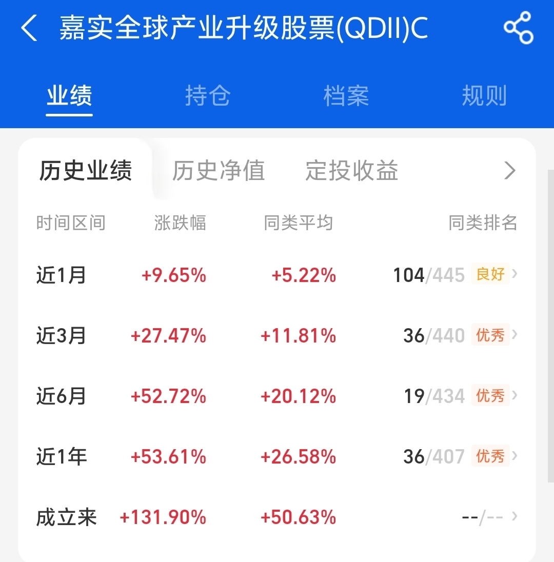 近期市场主线比较明朗,科技和产业升级相关板块表现一直比较稳,创业板指也到了阶段性的高点,全球范围内质地不错的资产,也受到不少资金关注。所以我计划再加一些仓位,$嘉实全球产业升级股票发起式(QDII)C$ 我觉得还可以。它主要覆盖A股、港股、美股里的核心资产,分散配置,避免集中在单一市场。从业绩来看,近一年涨幅超过50%,不同阶段的表现也都还可以,相比不少同类产品,表现要突出一些。再看持仓,里面既有像英伟达、超威半导体这样的全球芯片领域企业,也有中芯国际这类国内相关企业,布局集中在AI算力、半导体等领域,后续的发展空间值得留意。