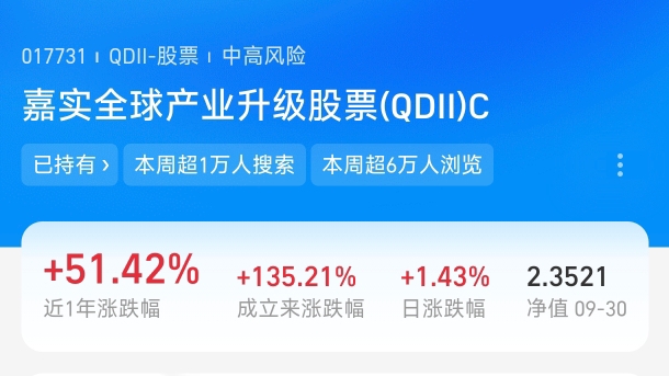 $嘉实全球产业升级股票发起式(QDII)C$ 昨天更新后,上涨1.43%,蛮给力的,该基金主打美股和港股,重点布局芯片半导体等科技前沿方向!近3个月上涨29.00%,近6个月大涨55.85%,大幅跑赢同类基金呢,长期我是看好的,准备慢慢布局了!