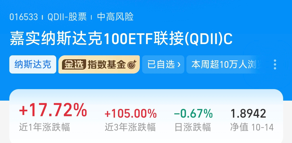 $嘉实纳斯达克100ETF发起联接(QDII)C人民币$ 这只紧密跟踪指数,走势比较稳健,总体来说涨多跌少,近一年上涨17.72%,还是很优秀的!还指数重点成分股包含英伟达,特斯拉,苹果等热门!今晚开始这一波回血反弹了,后市值得期待啊!