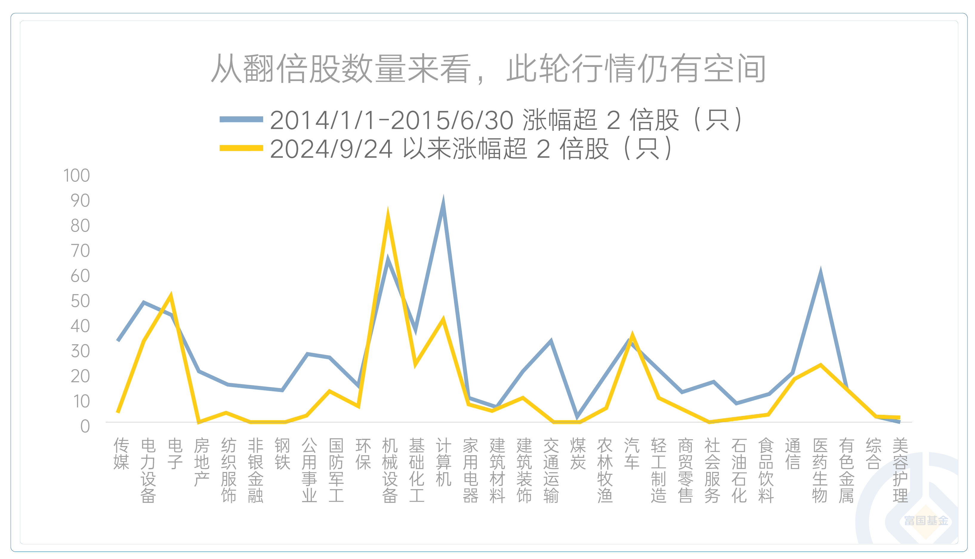 最后,富二还想为各位客官奉上一组数据,由此或许可以窥得当前这轮行情的进度:如果咱们把这轮行情翻倍股的数量和2014年到2015年中那段时间翻倍股的数量进行对比,不难看出,这轮行情仍有不小的空间。