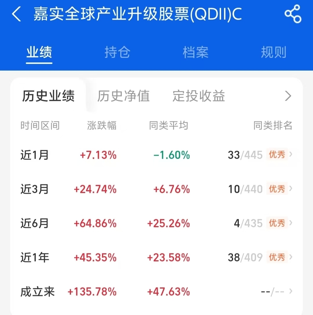 经过了前阵子的回踩,市场也是开始企稳了呢,接下来我打算继续增加仓位了,找了几只不错的产品,觉得嘉实全球产业升级股票C$嘉实全球产业升级股票发起式(QDII)C$ 还挺不错的。它不局限于单一市场,境内A股、港股和海外优质市场都布局,最低20%仓位分别扎根国内外,把新能源、AI这些全球热门赛道的机会都网罗进来。专业团队自下而上挑公司,专选有核心竞争力的优质企业,当然,业绩最有说服力,他近一年收益超40%,长期收益看得见。作为股票型基金,虽风险比债基高,但能更直接的分享产业升级红利呢。