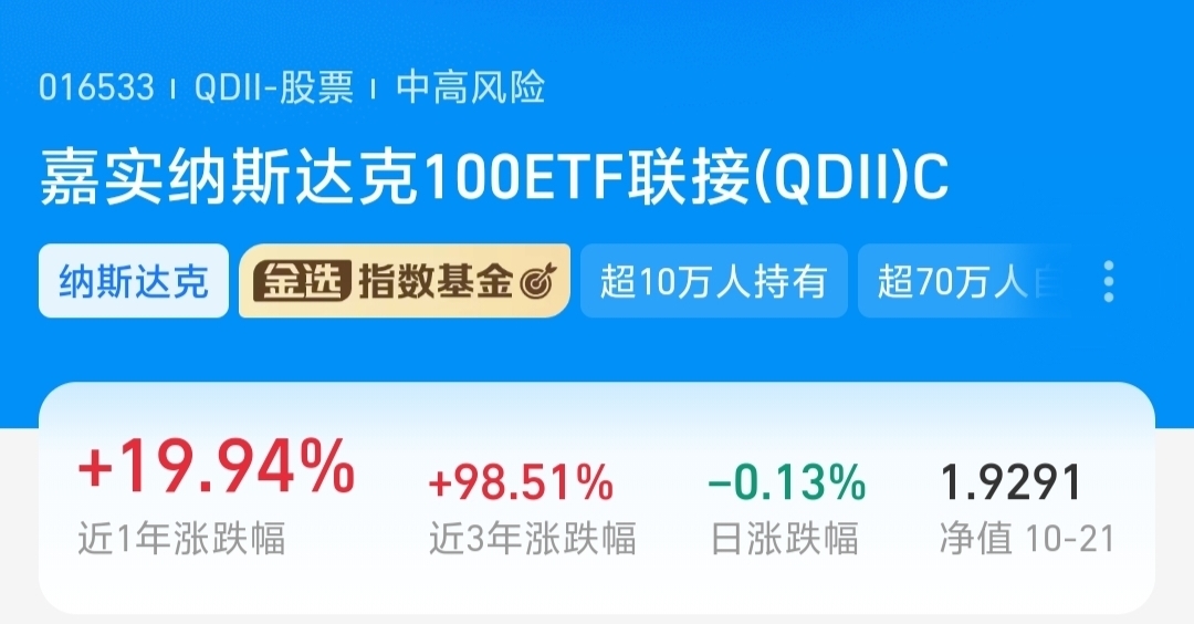 现在还记得去年的时候一直认为美股在高位,不敢入手,没想到到了今年依然如此呢,果然是强者恒强啊,不想继续等下去了,打算入手一波$嘉实纳斯达克100ETF发起联接(QDII)C人民币$ 这只基金专门跟踪纳斯达克100指数,把100家顶尖非金融公司打包,AI、半导体、云计算这些热门赛道全覆盖 。成立以来收益快翻倍,近一年收益也是高达19.94%,长期跑赢不少同类 。而且C类费率,零申购费,持有满7天还免赎回费,短期进出也划算 。背靠嘉实基金专业管理,境外托管靠谱,不用操心选个股,还是很划算的