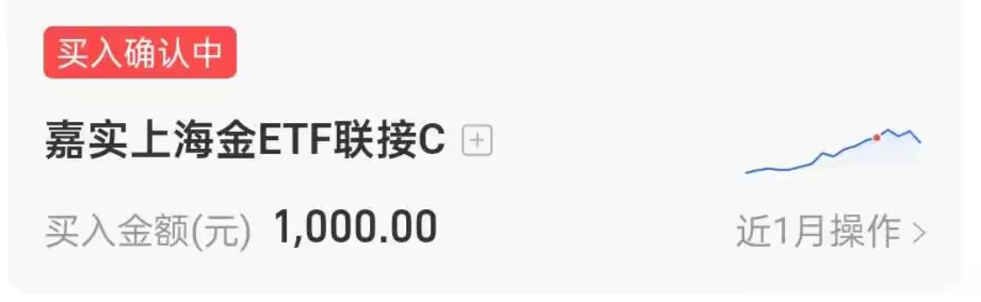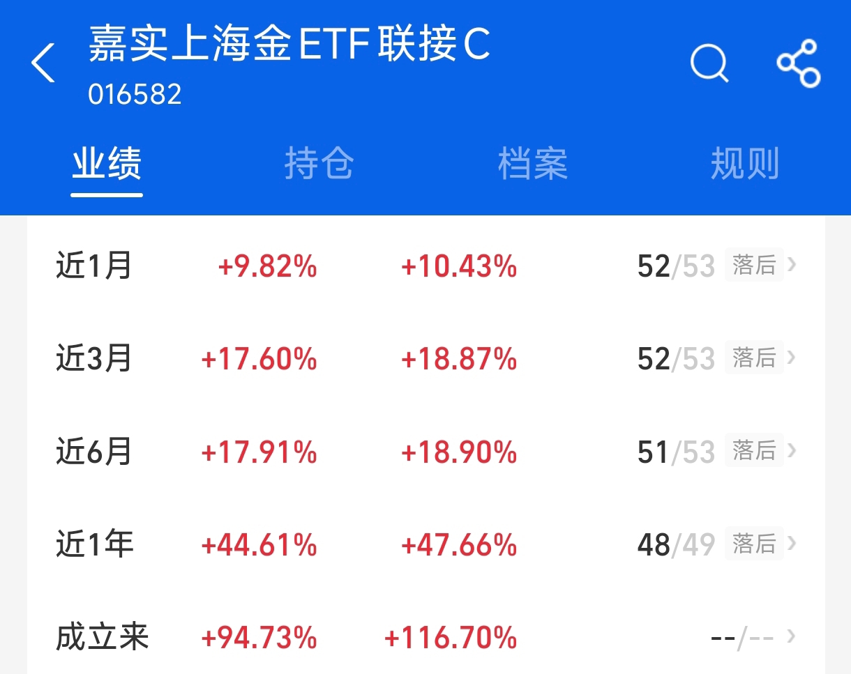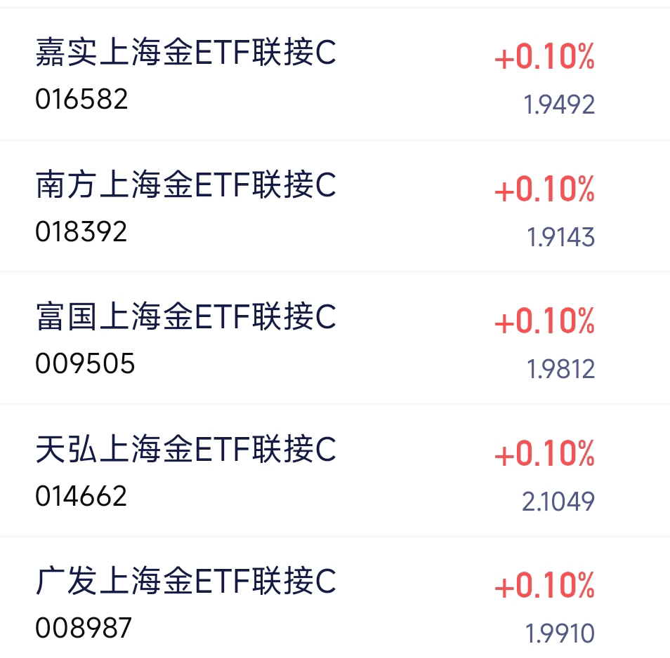 $嘉实上海金ETF发起联接C$ 还是不错的,不但费率低,还是七天免赎回,操作起来灵活方便的很,收益也是很优秀的,近1个月上涨9.82%,近一年上涨44.61%,长拿在手的话,收益更是可观呢,目前估值小涨0.10%,今天趁着现在位置不错,再加上一笔!