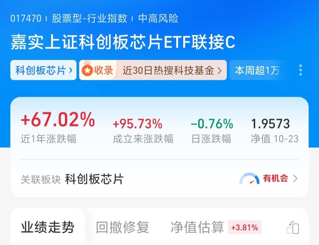 今天市场表现不错,科创芯片领涨,大科技终于开始反弹了!十五五规划盯紧数字科技,加上AI算力爆发、半导体技术频频突破,芯片风口这不就来了!所以趁着刚刚开始,我打算加仓$嘉实上证科创板芯片ETF发起联接C$ 它紧密跟踪科创芯片指数,仓位几乎都在芯片核心环节,中芯、寒武纪这些龙头都在里面。行情来了爆发力也很强。作为ETF基金,不用开户,手机就能买,门槛也很低。跟踪误差严控,能精准踩准板块节奏。所以今天我打算布局一下,看好它接下来的表现!