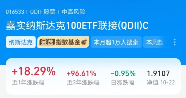 近期纳斯达克100指数是震荡着往上走的,整体表现挺强。虽说现在估值看着不算低,但是美股长牛主要是靠企业业绩撑起来的。像苹果、英伟达这些大公司,在AI、芯片这块儿业务一直在发力,再加上美联储降息的好消息,长期来看增长的劲头还挺足。所以我想着布局$嘉实纳斯达克100ETF发起联接(QDII)C人民币$ 。它直接把指数里100家头部科技企业打包在一起,90%以上的钱都投到对应的ETF上,跟得挺准。近一年涨了近20%,比不少同类热门产品表现好点。而且C类不用申购费,拿满7天也不用赎回费,算下来性价比还不错。