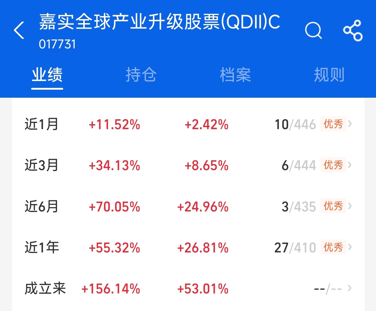 $嘉实全球产业升级股票发起式(QDII)C$ 这只主要布局美股科技和港股科技,持仓中有英伟达等行业龙头,业绩非常优秀,近一个月上涨11.52%,近3个月上涨34.13%,近6个月上涨70.05%,同类中排名靠前,我是定投上车的,收益可观,对于美股科技走势还是看好的,今天再上车一笔!