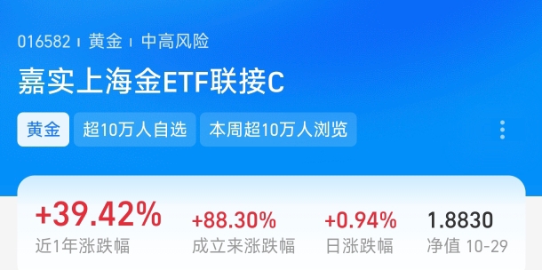 经历了多日回调的黄金逐渐企稳了!今天盘中虽有回落,但是现在现货黄金又拉升翻红了!随着美联储昨天降息25点,市场持续宽松,这有利于黄金的走强,长期来看,黄金是稳步上涨的!$嘉实上海金ETF发起联接C$ 就不错,昨天上涨0.94%,近3个月上涨16.74%,近一年上涨39.42%,看好后期反弹走势,趁低今天定投加仓一笔了!