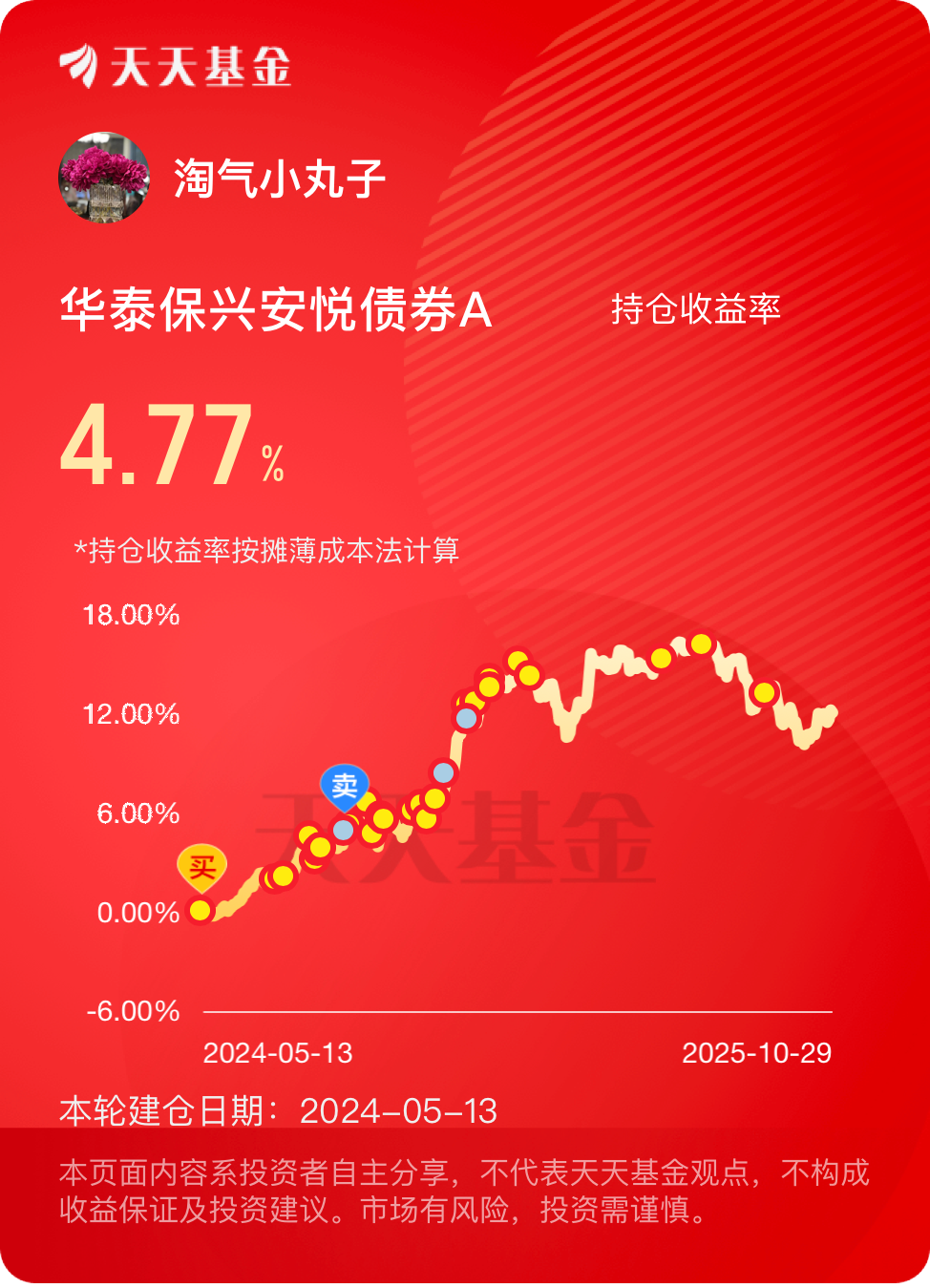 毕竟股市相对高位了,资金也有一定的避险需求。继续加仓$华泰保兴安悦债券A$