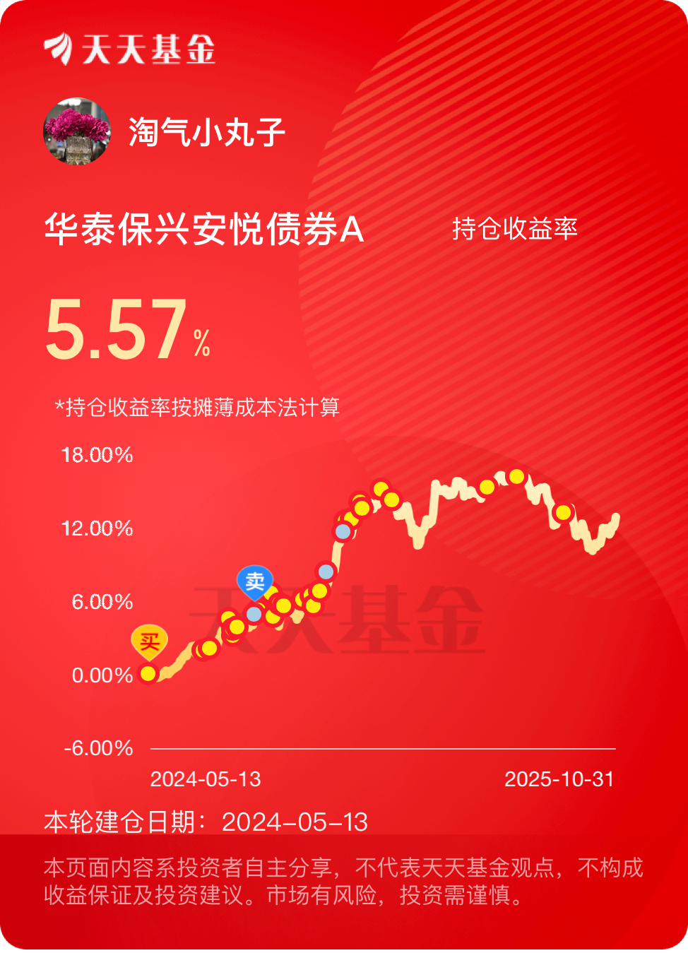 #上证指数# 最近市场流动性充裕,债市整体还是挺不错的,华泰保兴安悦安心拿好,上周五56蛋,这周继续加油$华泰保兴安悦债券A$ #晒收益#