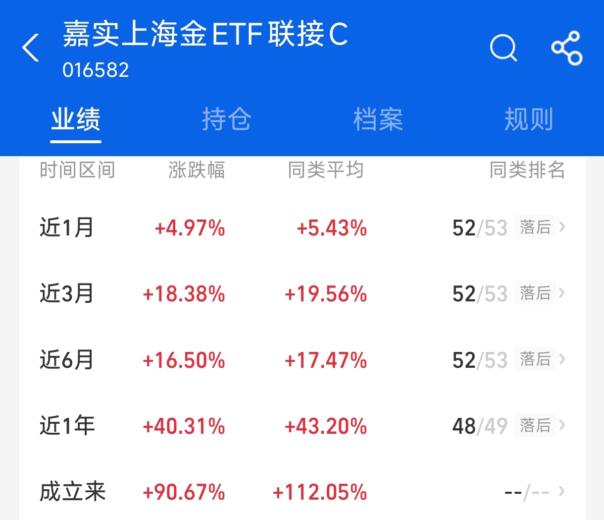 $嘉实上海金ETF发起联接C$ 我上车几次了,体验不错呢,总体业绩也亮眼,上周五上涨1.19%,近3个月上涨18.38%,近一年上涨40.31%,长拿收益可观呢!目前讨论区还有红包领呢,500-0.58元,1000-0.88元,还是挺香的,看好后续走势!