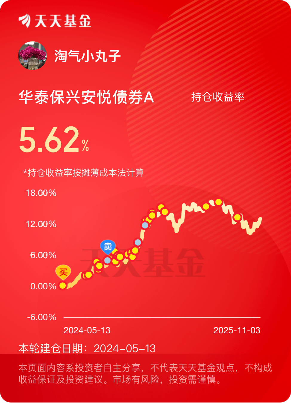 #上证指数# 现在这个阶段,债市的性价比看起来还不错,我顺势多加点华泰保兴安悦,最近收蛋不错的$华泰保兴安悦债券A$ #晒收益#