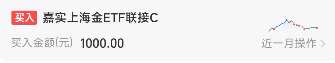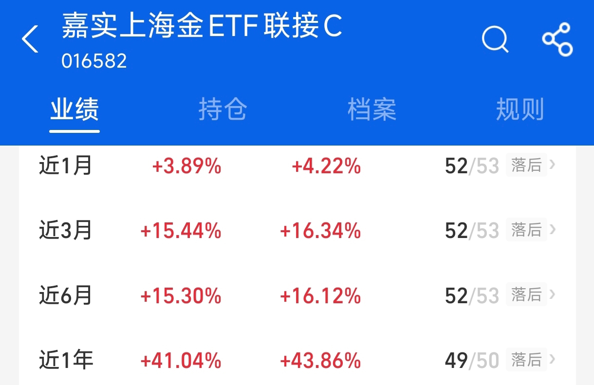 $嘉实上海金ETF发起联接C$ 这只还是不错的,前面震荡时回撤的比同类少不少呢,比较抗跌,防守能力优秀,涨起来幅度也很不错!过往业绩也优秀,近3个月上涨15.44%,近一年上涨41.04%,整体来说能涨抗跌,现在企稳了今天就继续定投加上一笔了!