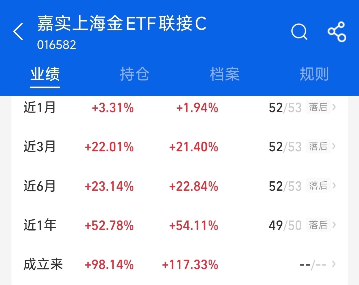 $嘉实上海金ETF发起联接C$ 今天上涨1.51%,近3个月上涨22.01%,近一年上涨52.78%,后续走势看好了,现在嘉实持有人还有福利呢,100-0.58,1000-0.88,还是不错的呢!我目前收益率1.43%,还是比较满意的,拿着,稳稳吃肉!