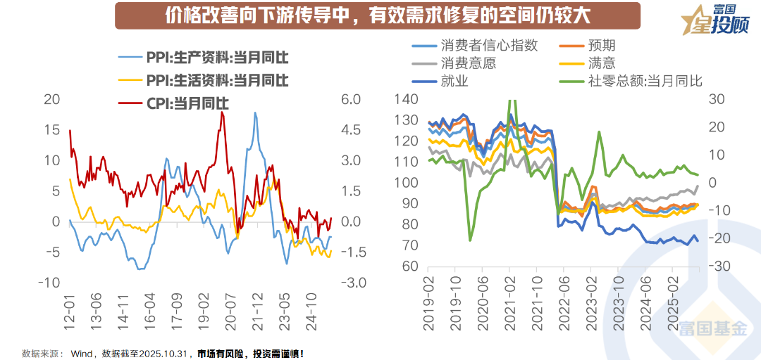 当前价格改善正由上游生产领域向下游消费端传导,但有效需求不足仍是制约价格回升的核心矛盾。PPI生产资料走势历来领先于生活资料,而PPI生活资料与CPI相对同步,2025年以来,PPI生活资料表现弱于CPI,反映出除服务类外的基础性消费品价格承压更甚。从消费者信心指数来看,各分项2025年改善明显,但就业分项持续偏弱,社零消费增速已难恢复至2019年前水平。要真正打通“收入增长—消费提升”的良性循环,政策层面需要多管齐下,通过促就业、稳收入、强保障等一系列措施,才能真正激发内生需求,促进价格指标的趋势性改善,目前来看,有效需求修复的空间仍较大。