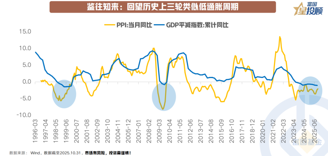 亚洲金融危机爆发后,外部需求萎缩、内部产能过剩叠加经济结构转型,PPI连续31个月处于负区间,GDP平减指数连续6个季度(1998Q3-1999Q4)为负,在积极财政政策、国企改革与脱困等措施下,价格指标走出低通胀区间,而在中国加入WTO后,价格指标实现趋势性向上。