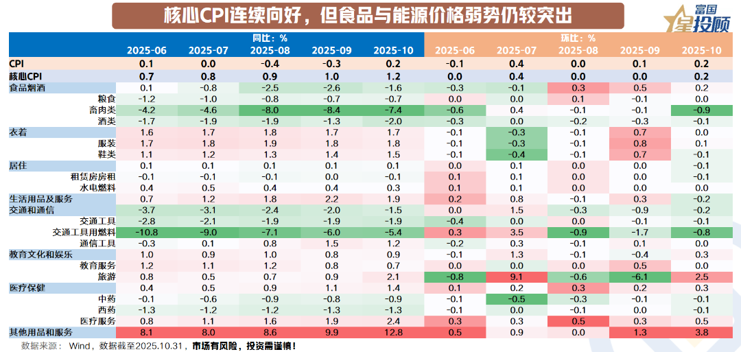 从近期数据表现来看,10月CPI同比回至正值区间,环比涨幅有所扩大,核心CPI同比连续6个月扩大,消费端价格呈改善趋势,但部分分项偏弱特征仍延续。分项来看,食品和能源价格维持低位是CPI偏弱的主要拖累,食品方面,畜肉类价格降幅较显著,粮食、酒类等亦呈负增长趋势;能源方面,国际原油价格走低致使国内能源价格处于收缩区间,降幅趋势收窄但环比降幅仍偏高。扣除食品和能源价格的核心CPI涨幅连续扩大,10月为节假日出行旺季,旅游分项同比与环比均明显改善,服务消费恢复趋势较稳健。
